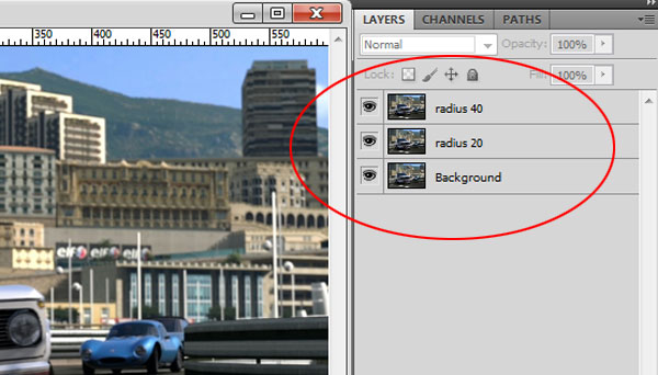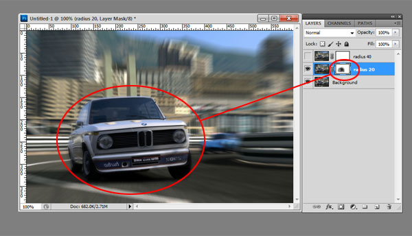 Our next steps will involve the use of layer masking to reveal our sports car amongst the blur effects. Select each of the radius layers and add a layer mask to each one. There is a handy shortcut button for this located in the footer of the layers window that will add the mask to the selected layer.