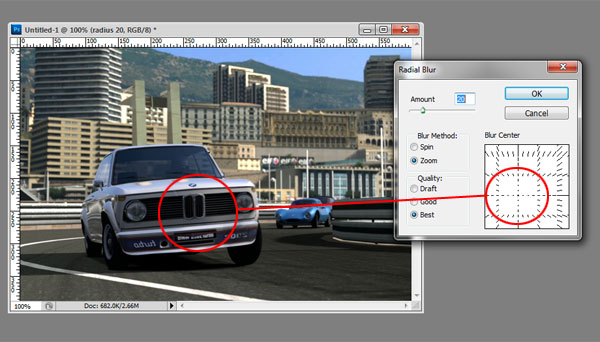 Our next step is to add the filter effect to each of the duplicated layers. We start by selecting the radius 20 layer and adding: Filter -> Blur -> Radial Blur… This will bring up the options for the effect. We set the effect for this as follows: Amount = 20, Blur Method = Zoom, Quality = Best. We also drag the Blur Center to the approximate location of our subject, the BMW sports car.