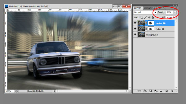Repeat this same masking process for the radius 40 layer. This will result in having your focus object completely visible and everything else blurred. The final step is to adjust the opacity of the radius 40 and radius 20 layers. The amount set is completely subjective. You will need to find the balance that works for you. We set the opacity to 75% for both layers in this example.