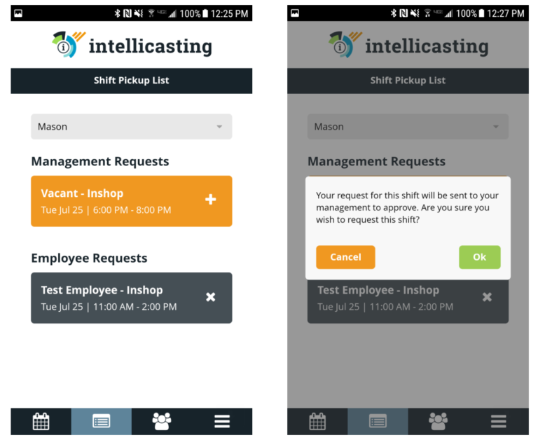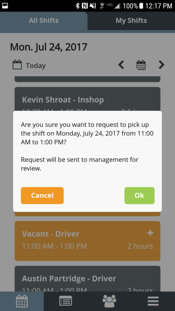 You can view the Shift Pickup List to view manager requested shifts and employee requested shifts by selecting the “+” icon. Managers can broadcast vacant shifts that they are trying to get covered. You can also pickup shifts from other employees that they are trying to get covered.