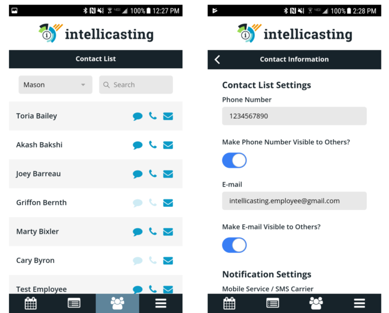 - Contact other employees via text, email, or phone directly through the mobile app